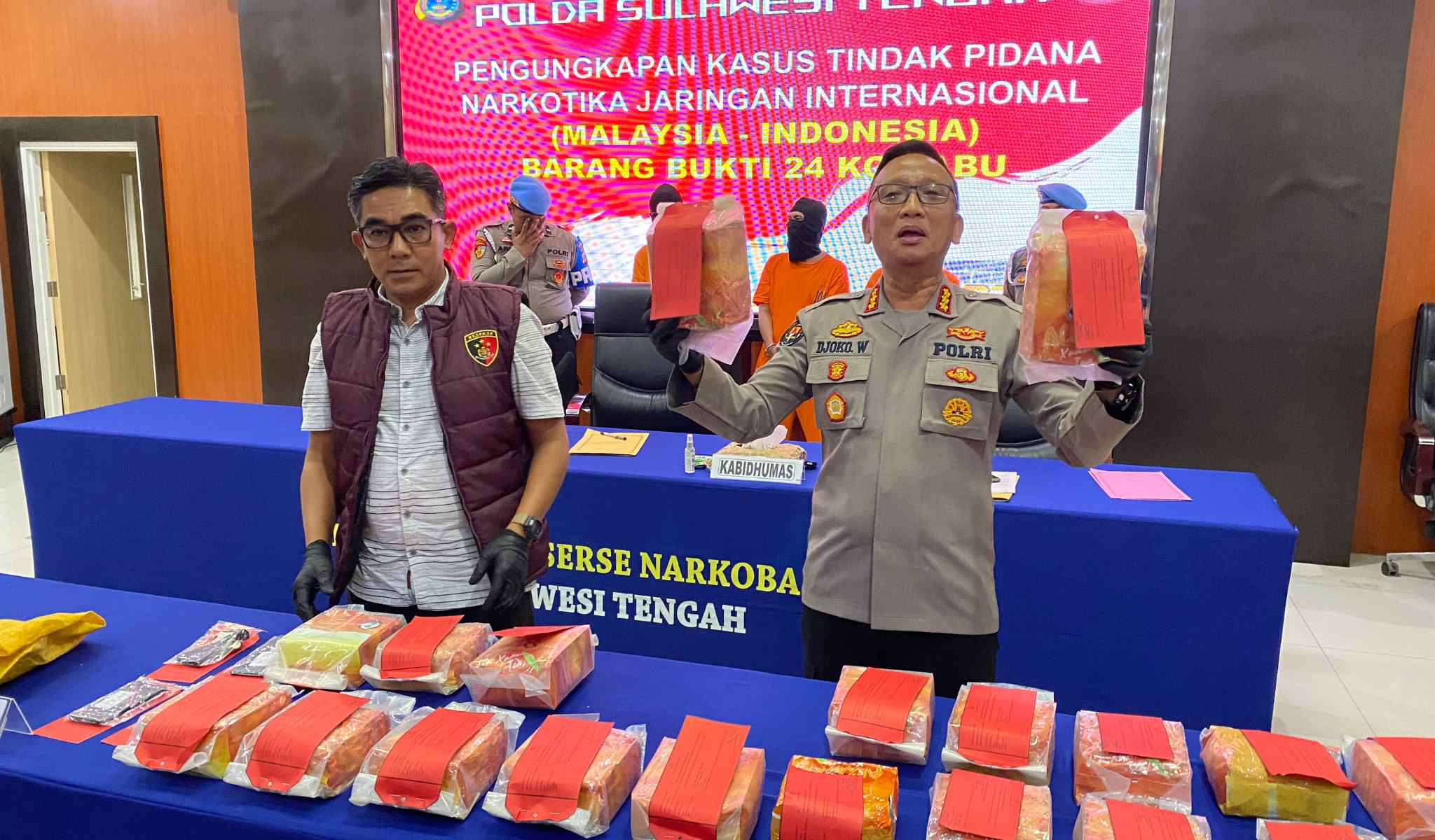 Dirresnarkoba Kombes Pol Pribadi Sembiring dan Kabid Humas Polda Sulteng Kombes Pol Djoko Wienartono menunjukkan barang bukti Sabu.(Foto: Firsha Mawaldy/Berandakata) PALU – Jaringan narkoba lintas negara kembali terbongkar. Direktorat Reserse Narkoba Polda Sulawesi Tengah berhasil menyita 20 kilogram sabu asal Malaysia yang hendak diedarkan di Kota Palu. Penangkapan dilakukan di Jalan Trans Sulawesi, Kelurahan Watusampu, pada Senin dini hari (21/4/2025).